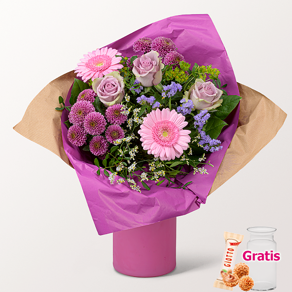 Fliederfarbene Rosen werden mit pinken Santinibällen und rosafarbenen Germini kombiniert. Weißes Limonium, fliederfarbene Statice und Bupleurum sorgen für eine feine, strukturierte Auflockerung. Pistochia, Salal sowie eine pinke Manschette schließen den Strauß harmonisch ab. Durchmesser ca. 30 cm. Frisch für Dich zusammengestellt, mit Pflegetipps, Blumennahrung und Wasser versorgt. Hersteller:FloraPrima GmbHDidderser Str. 2838176 Wendeburginfo@floraprima.de