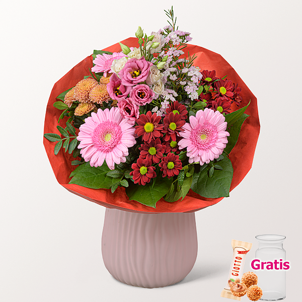Rosafarbenes Lisianthus wird mit rosafarbenen Germini zu einer weichen Blütenbasis kombiniert. Ein lachsfarbener Santiniball, rote Santini und rosafarbene Wachsblumen setzen gezielte Farbakzente. Pistochia und Salal tragen die Komposition, eine rote Manschette fasst den Strauß klar zusammen. Durchmesser ca. 30 cm. Frisch für Dich zusammengestellt, mit Pflegetipps, Blumennahrung und Wasser versorgt. Hersteller:FloraPrima GmbHDidderser Str. 2838176 Wendeburginfo@floraprima.de