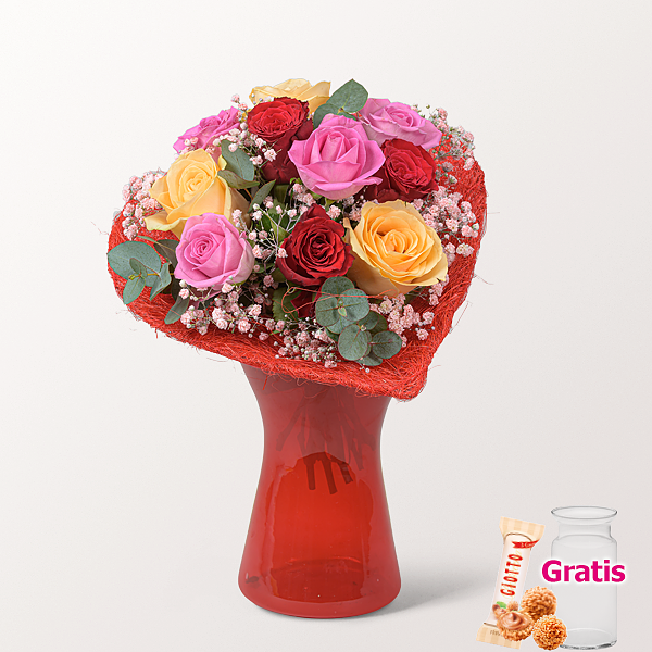Rote Rosen, rosafarbene Rosen und Rosen Avalanche Peach prägen diesen ausdrucksstarken Strauß. Zart hellrosa gefärbtes Schleierkraut und Eukalyptus lockern das Gesamtbild auf. Die rote Sisalherzmanschette setzt einen klaren emotionalen Akzent. Durchmesser ca. 30 cm. Frisch für Dich zusammengestellt, mit Pflegetipps, Blumennahrung und Wasser versorgt. Hersteller:FloraPrima GmbHDidderser Str. 2838176 Wendeburginfo@floraprima.de