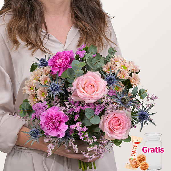 Rosafarbene Rosen Avalanche stehen im Zentrum dieses eleganten Straußes. Blaue Disteln, pinke Nelken, lachsfarbene Santini, rosafarbenes Limonium und rosa Statice sorgen für Tiefe und Struktur. Eukalyptus verleiht dem Arrangement eine moderne grüne Note. Durchmesser ca. 30 cm. Frisch für Dich zusammengestellt, mit Pflegetipps, Blumennahrung und Wasser versorgt. Hersteller:FloraPrima GmbHDidderser Str. 2838176 Wendeburginfo@floraprima.de
