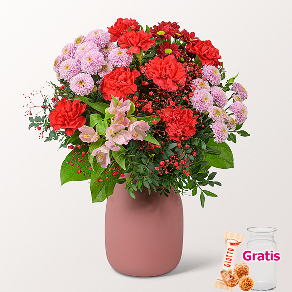 Rote Nelken bilden das kräftige Zentrum dieses Straußes. Rot gefärbtes Schleierkraut, rosafarbene Santinibälle, rote Santini und rosafarbene Alstromeria schaffen Tiefe und einen weichen Gegenpol. Pistochia und Salal runden die Komposition mit stabiler Grünstruktur ab. Durchmesser ca. 35 cm. Frisch für Dich zusammengestellt, mit Pflegetipps, Blumennahrung und Wasser versorgt. Hersteller:FloraPrima GmbHDidderser Str. 2838176 Wendeburginfo@floraprima.de