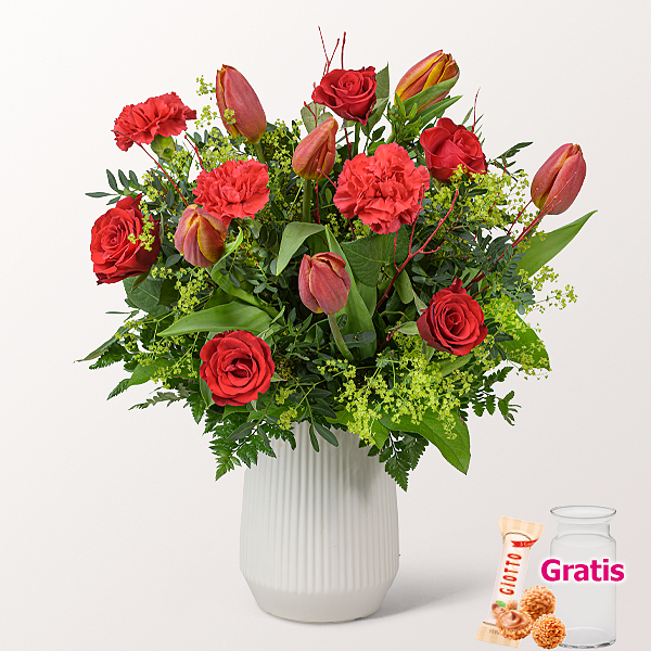 Rote Rosen und rote Tulpen bilden die kräftige Basis dieses Straußes. Alchemilla und rote Nelken sorgen für Fülle, während Pistochia, Salal und Lederfarn die grüne Struktur tragen. Rote Birkenzweige setzten einen natürlichen Akzent. Durchmesser ca. 35 cm. Frisch für Dich zusammengestellt, mit Pflegetipps, Blumennahrung und Wasser versorgt. Hersteller:FloraPrima GmbHDidderser Str. 2838176 Wendeburginfo@floraprima.de