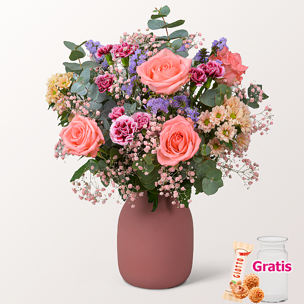 Lachsfarbene Rosen treffen auf fliederfarbene Statice und lachsfarbene Santini zu einer warmen, harmonischen Komposition. Pink-rosafarbene Spraynelken und hellrosa gefärbtes Schleierkraut bringen Leichtigkeit und feine Struktur. Eukalyptus setzt den modernen grünen Akzent und rundet das Gesamtbild ab. Durchmesser ca. 35 cm. Frisch für Dich zusammengestellt, mit Pflegetipps, Blumennahrung und Wasser versorgt. Hersteller:FloraPrima GmbHDidderser Str. 2838176 Wendeburginfo@floraprima.de