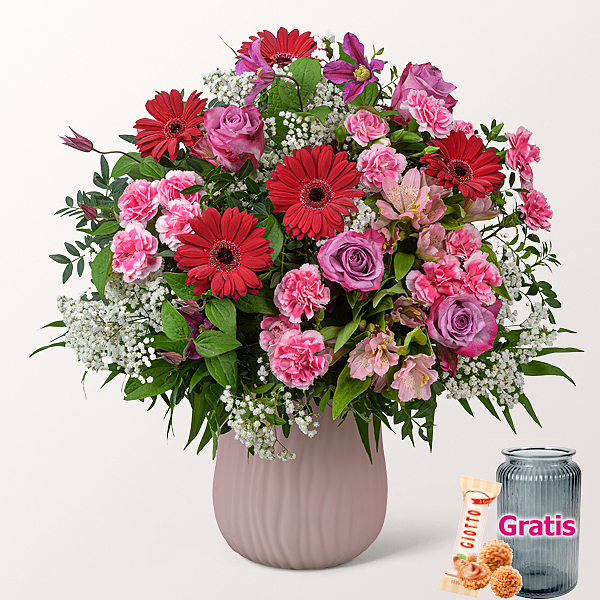 Bordeauxfarbene Germini werden mit lilafarbenen Clematis und weißem Schleierkraut kombiniert. Rosafarbene Alstromerien, lilafarbene Rosen und rosa-weiße Spraynelken ergänzen die Blütenstruktur. Pistochia und Chico Jumbo sorgen für Volumen und ein klares grünes Gerüst. Durchmesser ca. 45 cm. Frisch für Dich zusammengestellt, mit Pflegetipps, Blumennahrung und Wasser versorgt. Hersteller:FloraPrima GmbHDidderser Str. 2838176 Wendeburginfo@floraprima.de