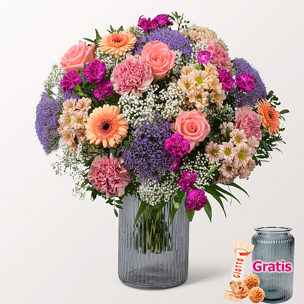 Fliederfarbenes Trachelium trifft auf altrosafarbene Nelken und lachsfarbene Germini. Weißes Schleierkraut, lachsfarbene Rosen und lachsfarbene Santini sorgen für eine ausgewogene Blütenfülle. Pinke Spraynelken sowie Pistochia und Chico Jumbo runden den Strauß mit Struktur und Volumen ab. Durchmesser ca. 50 cm. Frisch für Dich zusammengestellt, mit Pflegetipps, Blumennahrung und Wasser versorgt. Hersteller:FloraPrima GmbHDidderser Str. 2838176 Wendeburginfo@floraprima.de