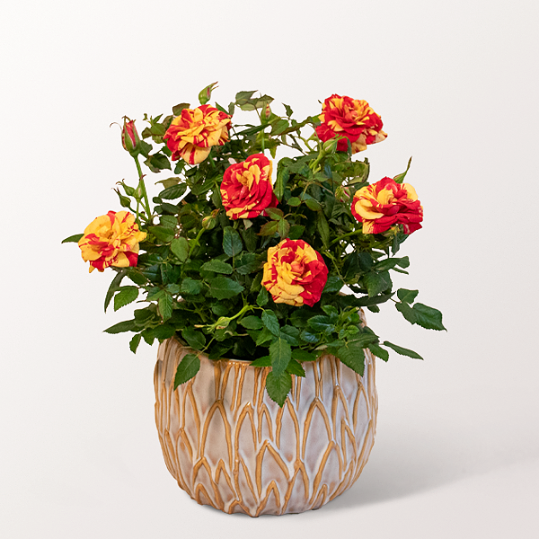 Süße, kleine Rose mit gelb-roter Blütenfärbung in einem Keramiktopf (Ø ca. 13 cm) mit außergewöhnlichem Muster. Die Höhe beträgt insgesamt ca. 30 cm.